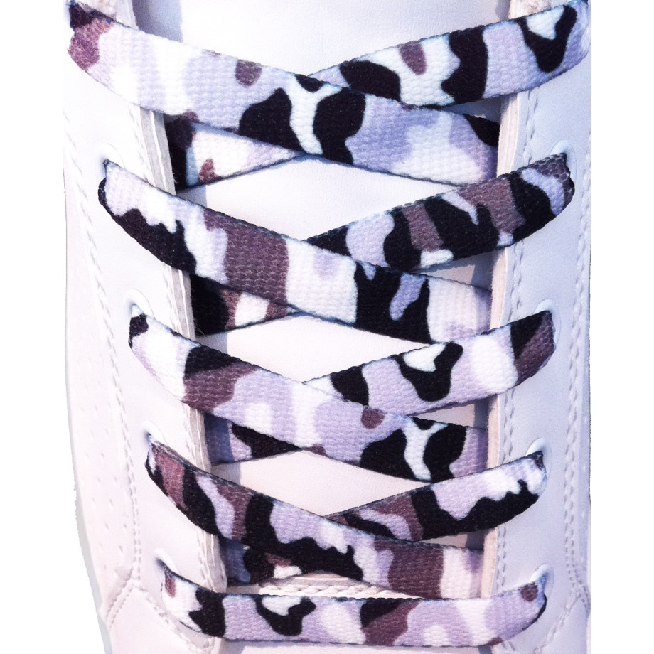 Estos cordones tienen un grosor de 10mm. Son más gruesos que los cordones que vienen incluidos al comprar calzado nuevo, lo cual mejora el efecto que le dan a los zapatos. Los estos cordones tienen un estampado de camuflaje en gris y negro. Son de alta calidad, duraderos, y tienen una buena textura (ver la imagen).