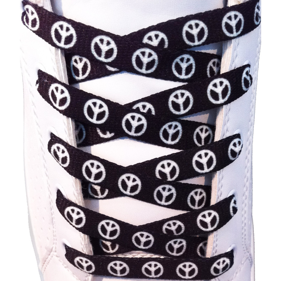 Estos cordones tienen un grosor de 10mm. Son más gruesos que los cordones que vienen incluidos al comprar calzado nuevo, lo cual mejora el efecto que le dan a los zapatos. Los estos cordones son negros con signos de la paz blancos. Son de alta calidad, duraderos, y tienen una buena textura (ver la imagen).